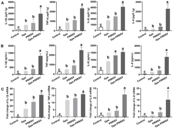 Proinflammatory cytokine levels in lungs and sera. At 6 days post-HP-PRRSV2 challenge, lung tissues and serum samples were collected from the pigs in each group. (A) Levels of IL-1β, TNF-α, IL-6, and IL-8 in lung homogenates were detected by ELISA. (B) Serum levels of IL-1β, TNF-α, IL-6, and IL-8 were detected by ELISA. (C) Cytokine mRNA levels in the lungs were determined by qRT-PCR. Data are the mean ± SD for three independent experiments (error bars). Data with different letters indicate significant differences at p < 0.05.