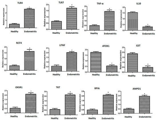 Differential transcript levels of immune, antioxidant, and erythritol-related genes between healthy (n = 65) and endometritis-affected (n = 65) dairy cows. The symbol * denotes significance when p < 0.05.