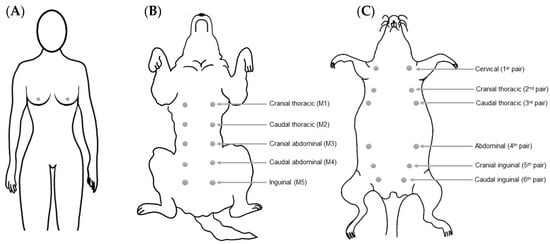 | Lymphatic drainage | Axillary lymph nodes and internal mammary lymph nodes (the main) Interpectoral, internal thoracic, supraclavicular, and infraclavicular lymph nodes [48,52] | Axillary lymph nodes (M1, M2 and M3) Superficial inguinal lymph nodes (M3, M4 and M5) [60,61] | Proper axillary node (all pairs) Accessory axillary lymph nodes (1st and second pair) Superficial cervical lymph node (1st pair) Inguinal lymph nodes (fourth, fifth and sixth pairs) [62] |