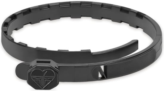 A collar product (Atopivet® collar, Bioiberica SAU, Esplugues de Llobregat, Spain) was developed using a polymer (TPU, thermoplastic polyurethane) matrix collar containing 2.5% LE Biosfeen®. The collar also incorporates 1.5% lavender oil to provide an appropriate smell, a plasticizer (2-ethylhexyl diphenyl phosphate) which provides flexibility to the collar and enhances the release of the active ingredient, and a black dye in order to protect the active ingredient from UV light (Figure 1). This collar was developed to be used, as its main indication, in dogs with atopic dermatitis.