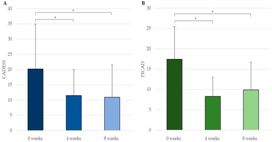 (A) CADESI-4 (mean+SD) and (B) PICAD (mean+SD) evaluations by the veterinarians at 0, 4 and 8 weeks. * p < 0.05.