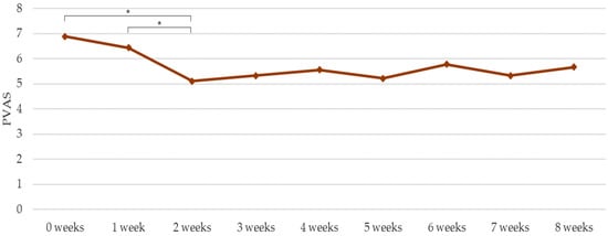 PVAS (mean) weekly evaluations by the pet guardians. * p < 0.05.