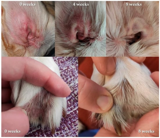 Representative images of the inner part of the pinnae (top images) and interdigital space (bottom images) in a Labrador retriever from the study after 0, 4, and 8 weeks.