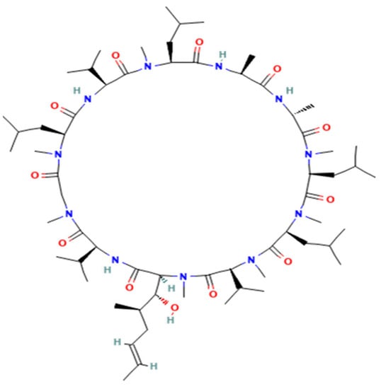 Cyclosporine, [(3S,6S,9S,12R,15S,18S,21S,24S,30S,33S)-30-ethyl-33-[(E,1R,2R)-1-hydroxy-2-methylhex-4-enyl]-1,4,7,10,12,15,19,25,28-nonamethyl-6,9,18,24-tetrakis(2-methylpropyl)-3,21-di(propan-2-yl)-1,4,7,10,13,16,19,22,25,28,31-undecazacyclotritriacontane-2,5,8,11,14,17,20,23,26,29,32-undecone, (C62H111N11O12)], isolated from Tolypocladium inflatum gams, is a cyclic undecapeptide. As a suppression immune system agent, it has been used in transplant patients, and for the treatment of dermatitis and psoriasis [1,2,3,4].