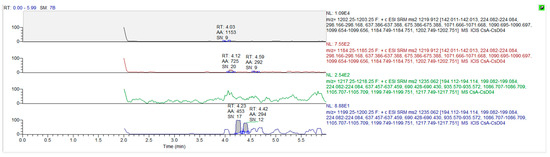 Method establishment used neutered cat blood samples collected at Beijing Yuanda Xinghuo Medicine Technology Co., Ltd. (Beijing China). Cyclosporine A and cyclosporine D were spiked into blank blood samples to establish the calibration curves at the concentrations of 10, 20, 50, 100, 500, 1000, and 2000 ng/mL. Each blood sample was analyzed for the concentration of cyclosporine using ultra-performance liquid chromatography–tandem mass spectrometry (UPLC-MS/MS). The UPLC equipment used in this study consisted of a Thermo vanquish ultra-performance liquid chromatography system coupled with a tandem mass spectrometer, Thermo Quantis, equipped with an electron spray ionization source. All the sample analyses were performed at 4–10 °C using an aqueous mobile phase (solvent A) containing formic acid at a concentration of 0.1% and ammonium acetate at a concentration of 2 mM. The organic mobile phase (solvent B) consists of methanol containing formic acid at a concentration of 0.1% and ammonium acetate at a concentration of 2 mM. The gradient elution program consisted of an initial isocratic separation of 80% aqueous mobile phase for 0.80 min followed by a linear increase in aqueous phase concentration to 100% at 0.85 min and then decreased to 0% at 2.5 min then for a further 3.5 min before returning to initial conditions. The column used was a Waters BEH C18 2.1 × 100 mm analytical column with a flow rate of 0.3 mL/min, the ejection of the volume was 3 µL and the temperature of the column was 60 °C. MS tuning was operated in positive electrospray ionization (ESI+) individual solution of cyclosporine A and cyclosporine D together with organic mobile (100%, 0.1 mL/min). The following parameters were used: ionic voltage: 3000 V, sheath gas: 50 Arb, aux gas: 25 Arb, ion transfer tube temp: 320 °C, and vaporizer temp: 330 °C.
