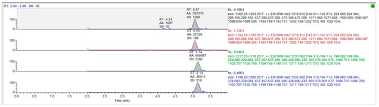 Frozen whole blood samples were thawed and vortexed, and 95 µL whole blood, 5 µL internal standard (500 ng/mL), and 900 µL methanol were mixed. Then samples were shaken for 3 min and centrifuged for 10 min at 11,100× g. After supernatants were filtered through a 0.22 µm microbore cellulose membrane, the samples were collected and bottled to UPLC-MS/MS system for analysis.