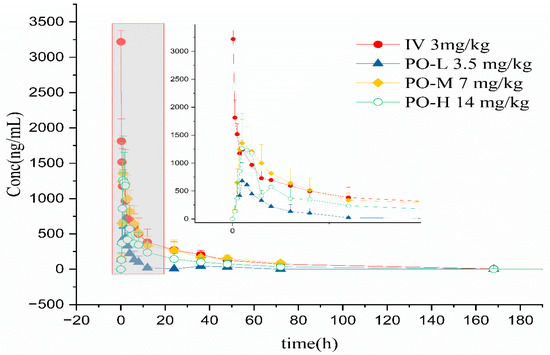 Few references have been reported on the pharmacokinetic process in cats. M.L. Mehl evaluated cyclosporine after intravenous and oral administration, which is similar to this study, and the oral administration was 3 mg/kg b.i.d., which showed the value of bioavailability is about 29 and 25% on days 7 and 14, respectively. In our study, the medium oral group demonstrated almost the same result [21]. Whole blood concentrations 2 h after administration were better correlated with AUC than trough concentrations. Yang investigated two cyclosporine oral solutions in cats to demonstrate the two formulations’ bioequivalence [22]. A single oral dosage at 7 mg/kg was given to display a little longer Tmax than in our study. Lai attempted to enhance the bioavailability of cyclosporine in beagle dogs in a nanoparticle formulation. He demonstrated that nanoparticles had a higher blood concentration than Neoral and a faster elimination rate [23], which held about 178% bioavailability compared to Neoral. He also used a two compartmental model to simulate the process of the drug in dogs. The absorption rate in beagle dogs was longer than that in cats.