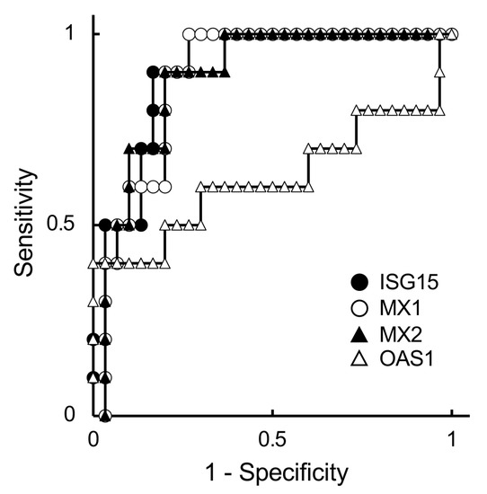 Receiver operating characteristic (ROC) curves of expression of ISGs in embryo-transferred JB cattle on day 21 of gestation. The expressions of ISG15 (closed circle), MX1 (open circle), MX2 (closed triangle), and OAS1 (open triangle) were analyzed using ROC curves. The horizontal and vertical axes are 1-specificity and sensitivity, respectively. Therefore, the upper-left corner is the ideal point with 100% sensitivity and specificity.