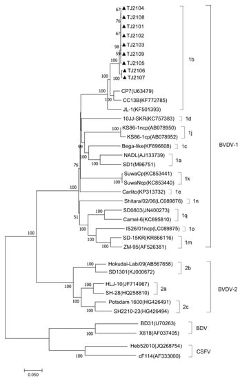 The TJ2102 and TJ2104 strains were CP BVDV strains, and the other isolates were NCP BVDV strains. Surprisingly, no nucleotide insertions were found in the NS2-3 protein of the two CP BVDV isolates. Studies have shown that the insertion between NS2 and NS3 is necessary for its cleavage in CP BVDV strains [], whether this characteristic of the TJ2102 and TJ2104 strains will affect the expression of NS3 remains to be further studied. In this study, the genome sequences of the nine isolates were compared with other reference strains. The new isolates had the highest similarity with the CP7 strain, sharing 92.2–96.3%, higher than other subgenotypes of BVDV such as BVDV-1o IS26/01ncp (77.9–78.2%) and BVDV-1n Shitara/02/06 (78.5–78.8%). The phylogenetic tree based on the genome sequence comparison showed that the new isolates were in the same branch with the BVDV-1b strains (CP7, JL-1 and CC13B), which was consistent with the analysis based on the 5′-UTR and Npro sequences.