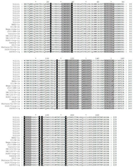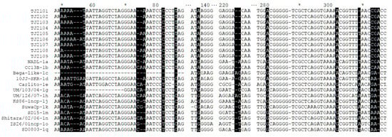 Sequence alignment of the 5′-UTR of the new isolates and 13 reference strains. Some nucleotide deletions or mutations of these isolates are shadowed and described in detail in the text. * represent a number. For example, the * between 60 and 80 is 70.