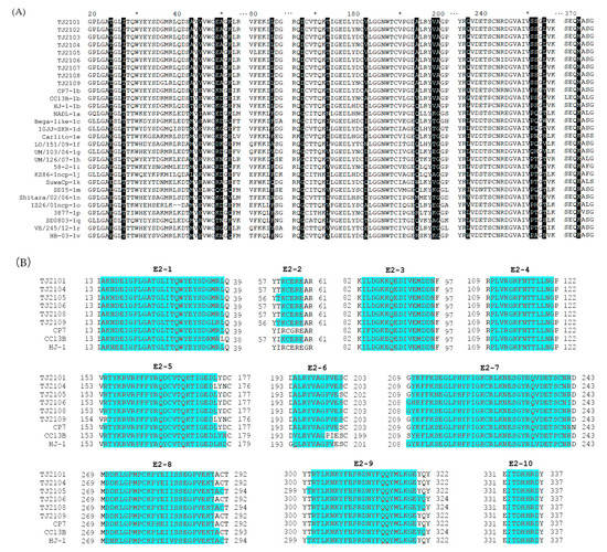 Amino acid sequence alignment of E0 of the 9 new BVDV isolates and 13 reference strains. Seven linear epitopes of E0 were found and are less lightly shadowed than the amino acid mutations region. * represent a number. For example, the * between 60 and 80 is 70.