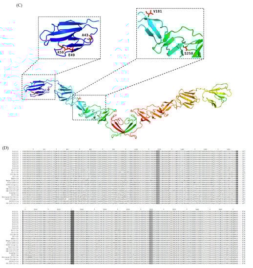 The E2 protein is an envelope glycoprotein in BVDV that is necessary for virus recognition, adsorption, and the entry into host cells. After the C-terminus of E0 binds to cell surface glycosaminoglycans (GAGs), E2 binds to CD46 to allow the virus to enter the cell [,]. E2 is the most antigenic protein in BVDV, and it is the main site that induces the production of neutralizing antibodies []. In the present study, some unique molecular features were found in the new isolates. Whether the epitopes are arranged in the correct conformation determines the efficiency of antibody binding. A change of a certain amino acid residue may affect the sequence or three-dimensional structure of the epitope []. These amino acid variations altered eight B cell linear epitopes of the isolate’s E2 protein, especially around position 60. Linear epitopes of viral proteins affect the antigenic structure and virus–antibody interactions, and the changes may affect the effectiveness of vaccination. Some special epitopes can be used in the development of new vaccines but the antigenic epitopes predicted using software cannot fully reflect the actual site of virus-induced neutralizing antibody production []. N-glycosylation is the most common form of protein glycosylation and has two forms, Asn-X-Ser and Asn-X-Thr. In the present study, a NET-to-NES substitution at position 230 was found in E2 of the new isolates and in other BVDV-1b strains. Studies have found that the replacement of serine with threonine greatly reduces the efficiency of N-glycosylation []. Whether this change affects the structure and function of the E2 protein remains to be further verified.