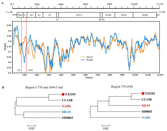 A recombination analysis of the full-length genome sequences of the new isolates and reference strains was conducted using RDP4 and SimPlot software. As shown in Table 1, recombination signals were found in most new isolates except TJ2103 around the 691–1155 nucleotides region, suggesting most new isolates may be recombined by the major parent BVDV-1a NADL strain and the minor parent BVDV-1m SD-15 strain (Figure 7A,B).