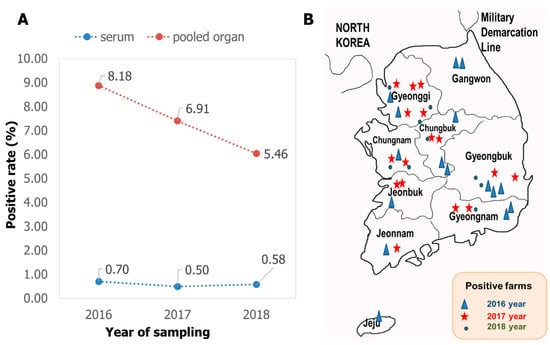 Summary of the prevalence of PIV5 in pigs in Korea. (A) The positive rate for serum and pooled organs from three consecutive years. (B) The chronological and geographic distribution of positive farms.