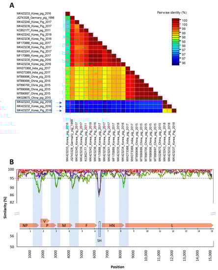 A total of 24 complete genomes of PIV5 detected from pigs with clear information are available in GenBank, all of them with 15,246 nucleotides. This study analyzed the genomic diversity of Korean porcine PIV5 in the context of all available PIV5 detected in pigs in some other countries. Using the genome of SER (the earliest porcine sequence) as the query, the genetic similarity between the other porcine PIV5 genomes were analyzed (Figure 2).