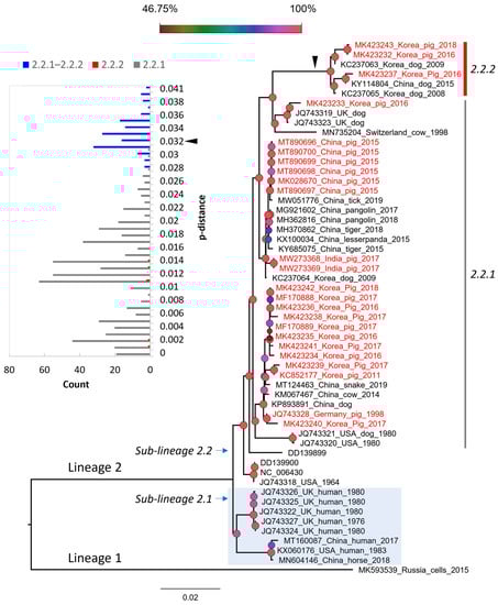 Based on the complete genome, PIV5 was divided into two proposed lineages (this study). Lineage 1 contained a single strain (MK593539), which is the most divergent PIV5 known to date. Lineage 2 contained sub-lineage 2.1 of the cluster of sequences detected in human and horse, and sub-lineage 2.2 of the mixture sequences detected in various animals, such as pig, dog, cow, tiger, etc. Based on the pattern of branching, sub-lineage 2.2 could be further divided into two groups, namely 2.2.1 and 2.2.2. Of the two, group 2.2.2 showed substantially more divergence than the rest. This classification was also supported by a bimodal distribution and marginal overlap of the genetic distance between the groups (inserted histogram, Figure 3). All porcine PIV5 collected in different countries (China, India, Republic of Korea) (highlighted in red, Figure 3) fell within the two mentioned groups. The Korean porcine PIV5 fell into the two groups of 2.2.1 and 2.2.2.
