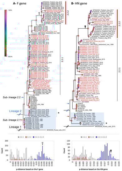 Based on the structure of the F and HN genes (Figure 4), the tree topologies were congruent with that based on the genome in general (Figure 3). A clear separation into two proposed lineages and two sub-lineages was maintained. However, for the F gene-based phylogeny, a topological change was observed in which some sequences from human and horse (*, Figure 4A,B) of sub-lineage 2.1 (based on the genome and HN gene) were now clustered within sub-lineage 2.2. Of porcine PIV5, the two groups of 2.2.1 and 2.2.2 were still observed and were supported by a discrete distribution of p-distances between them (inserted histograms, Figure 4). Group 2.2.2 was more divergent. The Korean porcine PIV5 strains were consistently located in the two groups of 2.2.1 and 2.2.2, as they were on the tree of the complete genome.