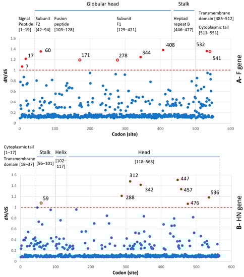 Plot of the dN/dS ratio for the entire (A) F gene and (B) HN gene. The dN/dS for each codon was estimated under the M8 model. The codons having dN/dS > 1 are highlighted in red. The filled and open red circles are non-synonymous substitutions, which occurred along the internal and external branches of the F- and HN-based phylogenies, respectively. The codons having dN/dS ≤ 1 are highlighted in filled blue circles. Just above each graph is the location (given in square brackets) of the functional regions of the corresponding F [,] and HN [,] proteins.