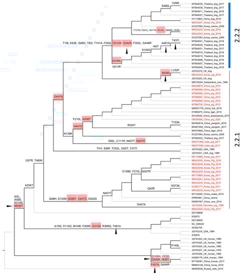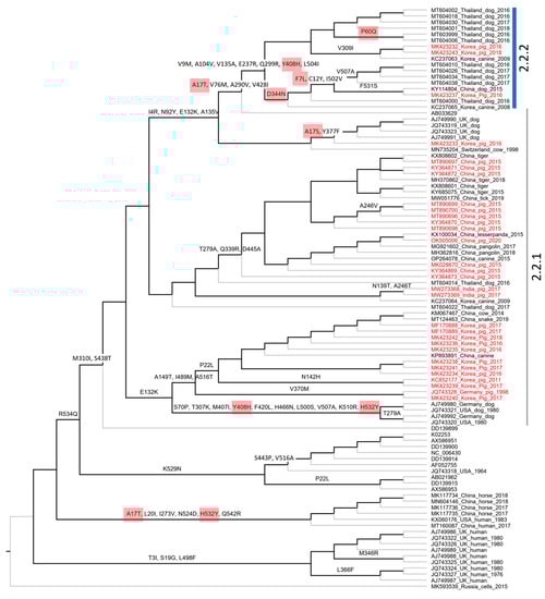 The overall genomic similarity among the porcine PIV5 strains was more than 96% and was congruent with the previous finding of high genetic similarity among PIV5 strains. The observation of higher diversity within the intergenic regions of the PIV5 genome was also in agreement with the previous study []. In the previous study, PIV5 strains were mostly clustered based on the natural or laboratory-detected host []. In this study, a large dataset of PIV5 sequences was applied for phylogenetic reconstruction, which in turn can systematically evaluate the diversity of PIV5 circulation worldwide. Except for the sub-lineage 2.1 that contained most of the human collected strains, a host diversity of the closed related strains within the remaining groups was observed. This result was in accordance with those reported elsewhere []. Additionally, in this study, a more divergent group was initially observed within the sub-lineage 2.2 (Figure 3 and Figure 4).