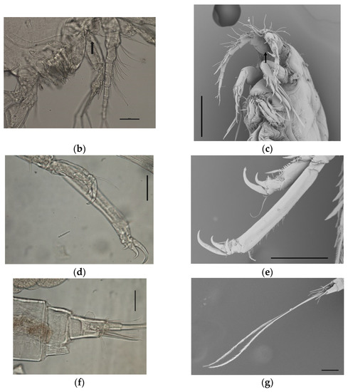 In detail, the morphological key features observed in our sample were the following: average body lenght ± sd (measured in µm) in females 1111.5 ± 61.6 (range 999.5–1189.46) (Figure 3a) and 1017 ± 79.8 (range 863.6–1133.5) in males; antennula made up of nine segments, with setae of variable numbers on segments 2–9; antenna with a short coxa, allobase carrying a coronula of spines on the inner side (Figure 3b,c), and a small exopod made up of two segments, having one and two setae, respectively; endopod of antenna carrying, overall, seven claws and three geniculate; maxilliped made up of a short syncoxa, having two setae at the distal end, a longer basis with two short setae at midlength, and a distal, hook-shaped endopod carrying two, very fine setae on the inner side; leg 1 having three small claws on both the endopod and exopod (Figure 3d,e); caudal rami being short (Figure 3f), with two elongated setae (average length 811.3 ± 56.7 in females, 831.1 ± 69.7 in males) (Figure 3g). No setae were observed on segment 2 of the exopode of leg 4.