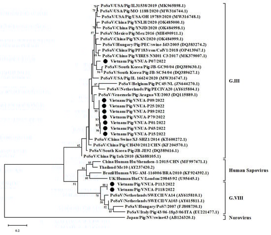 Dong, H.V.; Truong, T.H.; Tran, G.T.H.; Rapichai, W.; Rattanasrisomporn, A.; Choowongkomon, K.; Rattanasrisomporn, J. Porcine Sapovirus in Northern Vietnam: Genetic Detection and Characterization Reveals Co-Circulation of Multiple Genotypes. Vet. Sci. 2023, 10, 430. https://doi.org/10.3390/vetsci10070430