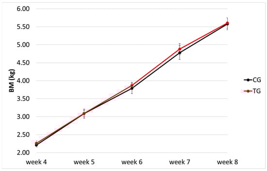 | week 5 | 54.7 ± 1.51 | 52.0–57.0 | 49.5 ± 3.39 | 44.2–55.5 | 0.0018 |