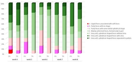 - Grellet, A.; Feugier, A.; Chastant-Maillard, S.; Carrez, B.; Boucraut-Baralon, C.; Casseleux, G.; Grandjean, D. Validation of a fecal scoring scale in puppies during the weaning period. Prev. Vet. Med. 2012, 106, 315–323. [Google Scholar] [CrossRef] [PubMed]