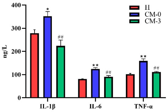 Serum concentrations of IL-1β, IL-6, and TNF-α in healthy cows and cows with CM before and after treatment with anemoside B4. H, healthy; CM, clinical mastitis; CM-0 is the day of diagnosis, CM-3 represents the three consecutive days of anemoside B4 treatment. Each column represents a group of samples. Data are presented as mean ± SEM. SEM means standard error of the mean. * p < 0.05; ** p < 0.01, CM-0 vs. H; ## p < 0.01 CM-0 vs. CM-3.