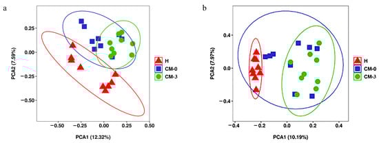 PCA score plot of the H group, CM-0 group, and CM-3 group. (a) Positive electrospray ionization mode (ESI+). (b) Negative electrospray ionization mode (ESI−). PC, principal component; H, healthy; CM, clinical mastitis; CM-0 is the day of diagnosis, CM-3 represents the three consecutive days of anemoside B4 administration.