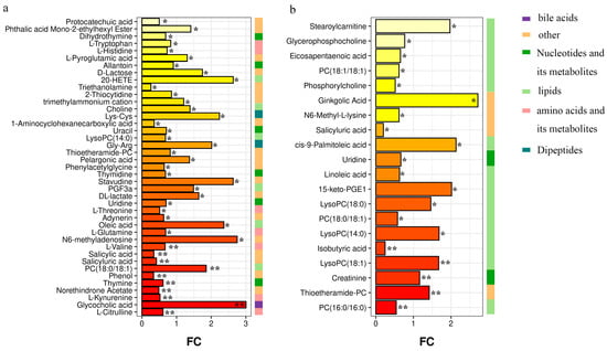 Differential metabolites analysis. (a,b) FC bar graphs of metabolites in H vs. CM-0 group and CM-0 vs. CM-3 group. The length of the bar represents the fold change (FC) of the metabolite between the two groups. The color of the bar indicates the significance of the metabolite difference between the two groups. FC > 1 stands for upregulated metabolites, FC < 1 stands for downregulated metabolites. * p < 0.05; ** p < 0.01. H, healthy; CM, clinical mastitis; CM-0 is the day of diagnosis, CM-3 represents the three consecutive days of anemoside B4 treatment.