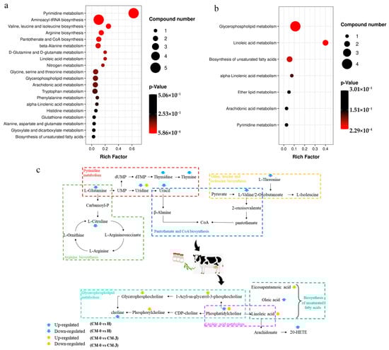 (a) Enrichment of differential metabolite KEGG pathway between H and CM-0 groups; (b) Enrichment of differential metabolite KEGG pathway between CM-0 and CM-3 groups. The x-axis denotes the rich factor. The y-axis indicates the metabolic pathway. Bubble size means the number of metabolites in the pathway; bubble color means p-value; the darker the color (red), the smaller the p-value; the darker the color (black), the higher the p-value. (c) Network metabolic map for differential metabolites. The altered pathways referred to pyrimidine metabolism, valine, leucine, and isoleucine biosynthesis, arginine biosynthesis, pantothenate, and CoA biosynthesis in cows with clinical mastitis; the targeted metabolic pathways in the CM cows treated with anemoside B4 mainly focused on glycerophospholipid metabolism, linoleic acid metabolism, and the biosynthesis of unsaturated fatty acids (p < 0.05). H, healthy; CM, clinical mastitis; CM-0 is the day of diagnosis, CM-3 represents the three consecutive days of anemoside B4 treatment.