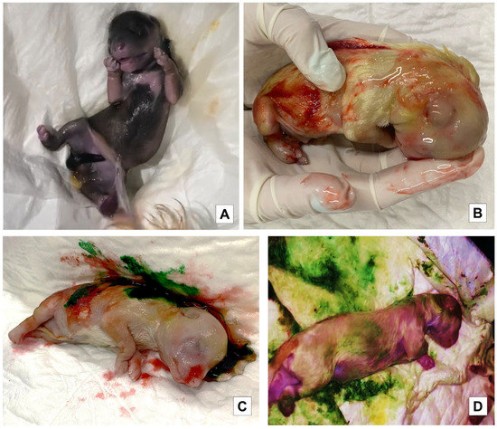 Different degrees of meconium staining on the skin in liveborn (LB) puppies. (A). Liveborn (LB) with amniotic fluid and no meconium staining. (B). Liveborn (LB) with mild meconium staining. (C). Liveborn (LB) with moderate meconium staining. (D). Liveborn (LB) with severe meconium staining.