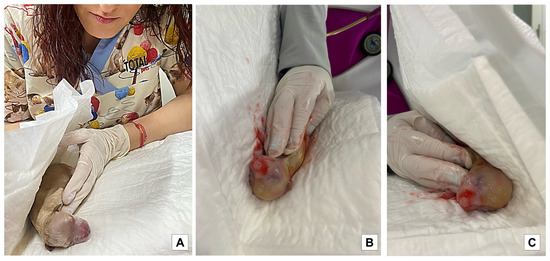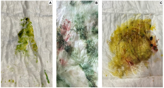 Methodology used to evaluate the degree of meconium staining in puppies. (A): The pup was gently picked up before the bitch began to lick it to prevent her from removing meconium staining if it was present. (B,C): The puppy was placed in a white diaper and surrounded with it to impregnate the meconium staining.