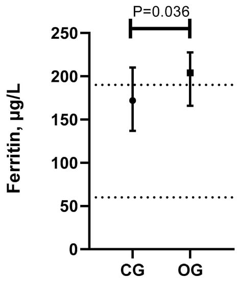 Serum ferritin levels were statistically higher in OG in this report; this agrees with human studies that described an increase in ferritin in obese individuals [,] and suggested that this increase is due to different pathways that could be related to inflammation and hypoxia [,].