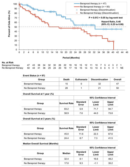 Baseline characteristics, coexisting disorders, and the incidence of chronic disorders were summarized and compared between the groups. Quantitative variables were characterized by their means, medians, 25th and 75th percentile (Q1 and Q3), and standard deviations, whereas the qualitative variables were according to the percentages of cats. The differences between the groups were tested by Mann–Whitney U test or Welch’s t-test for quantitative variables and Fisher’s exact test for qualitative variables. With regard to main-effect covariates: for beraprost and baseline characteristics (urea, phosphate, calcium, and urine protein), multivariable Cox regression models were constructed using forward stepwise selection. Only covariates with a multivariate p < 0.10 for beraprost and baseline characteristics by Wald test were retained. The veracity of the proportional-hazards assumption in the models was assessed by inspecting log–log plots of adjusted survival curves for parallel lines, and no violation of the assumptions was observed. Progression-free survival and overall survival were assessed with the Kaplan–Meier method and compared with a log-rank test. Hazard ratio for disease progression or death, summary of events (disease progression, treatment discontinuation, death, euthanasia), progression-free survival at 1 year with SE and 95% CI, overall survival at 1 and 3 years with SE and 95% CI, and median progression-free and overall survival with SE and 95% CI were analyzed. In order to demonstrate consistency of the treatment effect in subgroups, progression-free and overall survival analyses were performed, in which the hazard ratio and 95% CI were calculated using an unstratified Cox model, and p values were determined by Wald test. A commercial statistical software program was used for all analyses (BellCurve for Excel; Social Survey Research Information Co., Ltd., Tokyo, Japan). Statistical significance was set at 2-sided * p < 0.05, ** p < 0.01.