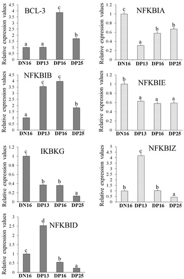 Relative expression values of IκB genes in ovine thymus. Note: Significant differences (p < 0.05) are indicated by different letters (a, b, c, or d) within the same color column.