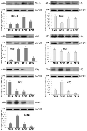 Expression of IκB proteins in the ovine thymus. Note: Significant differences (p < 0.05) are indicated by different superscript letters (a, b, or c) within the same color column (please find the WB full membrane in Figure S2).