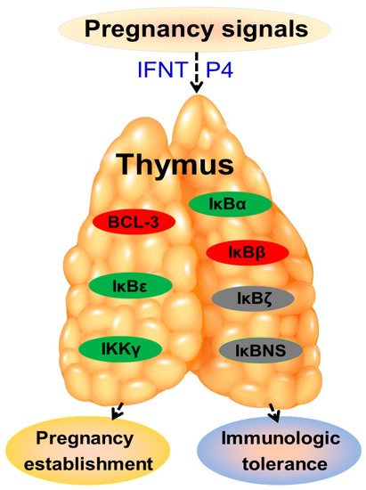 The thymus is implicated in central immune tolerance and plays essential roles during normal pregnancy. The inhibitor of the NF-κB (IκB) family is a key component of the NF-κB pathway; however, the modulation of the κB family in the maternal thymus by early gestation has not been fully understood. It has been found that there changes in the expression of the IκB family in the maternal thymus take place during early pregnancy, suggesting that IκB proteins are involved in modulating immunologic tolerance and pregnancy establishment.