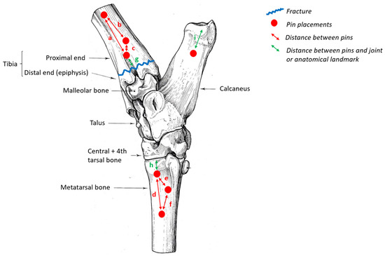 Next, 6 mm stainless steel Kirschner pins were placed into the lateral aspect of the distal tibia, the proximal metatarsal, and the calcaneus (see Figure 2 and Table 1).