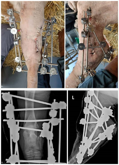 (a,b): pins and scaffold in place showing the angles between the pins; (c) Cranio-caudal and (d) latero-medial radiographs describing the pins and external scaffold. The letter “L” in the top left corner indicates that the radiographs regarded the left hind limb.