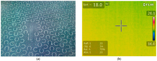 Photo of the floor surface: (a) normal image obtained with Flir E50; (b) thermographic image obtained with Flir E50; + (cross symbol) - spot of temperature.