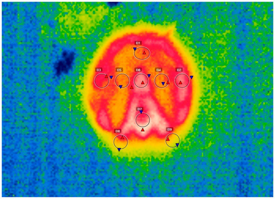 Six sections of the hoofprint were considered: El1—toe, El2 and El3—hoof wall, El4 and El5—sole, El6—frog apex, El7—frog, El8 and El9—heels. The mean temperatures for the toe (El1), frog apex (El6), and frog (El7) were taken into account, and for the remainder parts, the average between the mean areas was used, so for the hoof wall it was (El2 + El3/2), for the sole it was (El4 + El5/2) and for the heels it was (El8 + El9/2) (Figure 2). Each considered region was 5 × 3 pixels in size. We used the FLIR Tools software for picture interpretation to determine the mean temperatures of each area from the hoofprint, and the technique was carried out by the same operator.