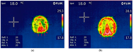 In contrast to radiography or computed tomography, the thermographic examination does not use any penetrating radiation and expensive devices. Also, the anatomical part that is examined does not receive X-rays, like in radiography; it is not placed in an electromagnetic field as in magnetic resonance imaging and does not use any radioactive substances, as in scintigraphy [12,16]. Thus, thermography scans can provide insight into inflammatory processes which affect blood flow to the feet [17]. It can show changes in temperature that may be associated with tendinitis, navicular syndrome, laminitis, sole abscesses and other hoof-related structural problems [18,19]. The thermographic scan provides an opportunity to discover subclinical inflammation in horse limbs 14 days before the clinical symptoms appear [20]. The advantages of using thermography are rapidity in the millisecond range and facilitating measurement of moving targets. Other advantages are provided by noncontact procedures, allowing measurements of hazardous or physically inaccessible objects, with no interference and no energy lost from the target [21,22,23]. There is no risk of contamination and no mechanical effect on the surface of the object [21,22,23].