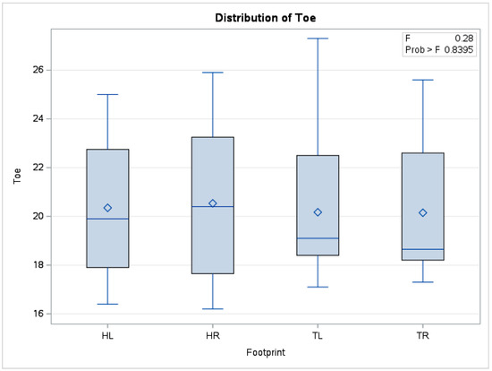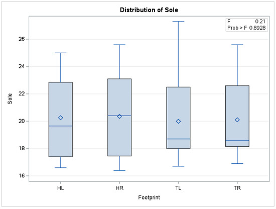 In the case of mean sole temperature, there were no statistically significant differences (p = 0.89) between the means obtained (n = 240) from forelimbs and hindlimbs. The boxplot in Figure 6 also shows distributions of the data series for the four limbs positioned in a similar relationship to each other.