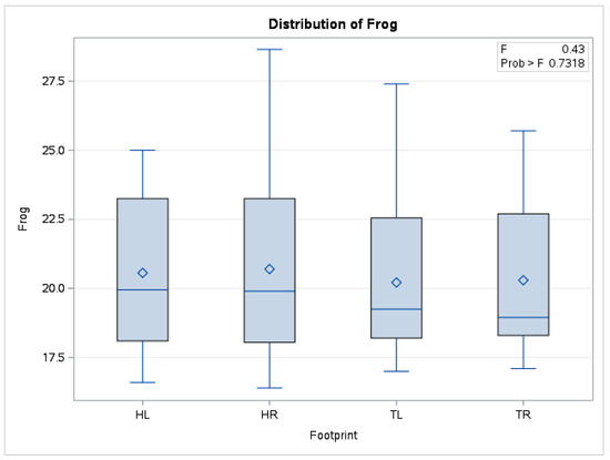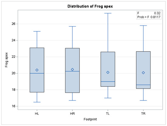 In the case of the mean frog apex temperature, there were no statistically significant differences (p = 0.81) between the means obtained (n = 240) from forelimbs and hindlimbs. The boxplot in Figure 8 also shows distributions of the data series for the four limbs positioned in a similar relationship to each other.