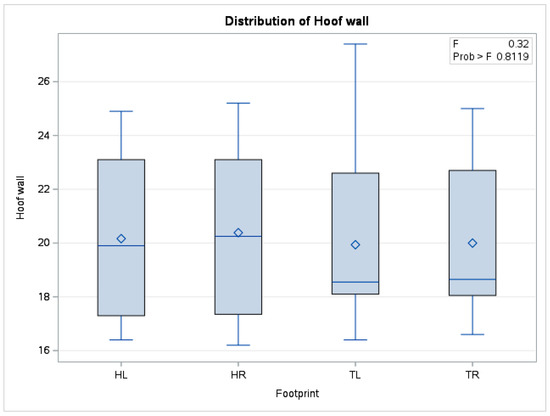 In the case of mean hoof wall temperature, there were no statistically significant differences (p = 0.81) between the means obtained (n = 240) from forelimbs and hindlimbs. The boxplot in Figure 9 also shows distributions of the data series for the four limbs positioned in a similar relationship to each other.