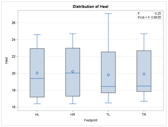 In the case of mean heels temperature, there were no statistically significant differences (p = 0.86) between the means obtained (n = 240) from forelimbs and hindlimbs. The boxplot in Figure 10 also shows distributions of the data series for the four limbs positioned in a similar relationship to each other.