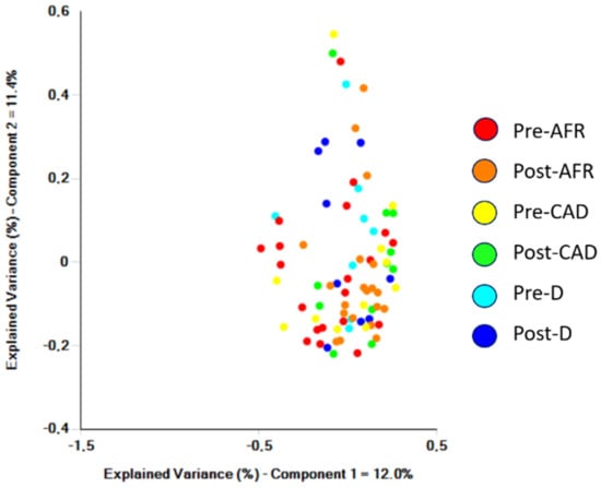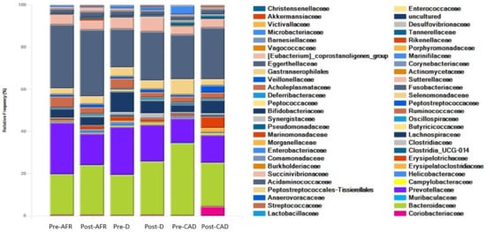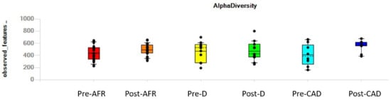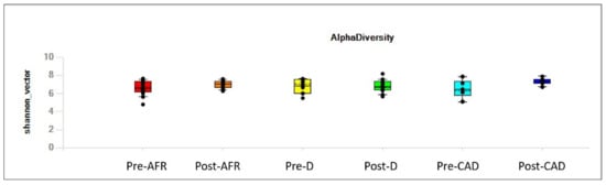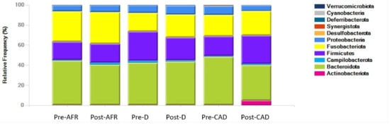On the contrary, analysis of microbiota differences (beta diversity) between pre-and post-diet samples found significant differences for the AFR and CAD groups. In post-diet samples in all groups, there was a decrease in the phylum Bacteroidetes, and the reduction was driven by the group of Bacteroides. Bacteria in the phylum Firmicutes increased significantly only in CAD dogs, while Proteobacteria, family Enterobacteriaceae were reduced (p-value 0.22).