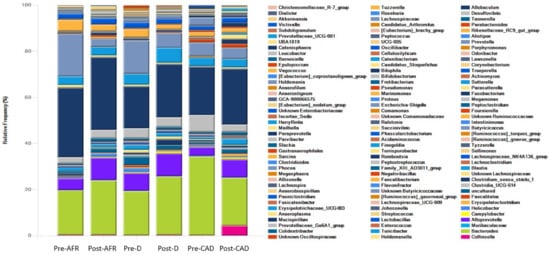 35], decreased importantly in all groups. However, CAD dogs seem to have a different microbiota pattern and different responses when compared to AFR and D dogs, because at the genus level,