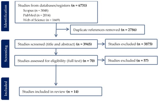 The systematic literature search yielded a total of 6731 articles, of which 1108 were found in all three databases (Figure 1 and Figure 2). After removing 2786 duplicates, 3945 articles were screened for relevance based on title and abstract. This resulted in the exclusion of 3875 articles, leaving 70 full-text articles for assessment. Upon conducting a full-text screening, studies that failed to meet the pre-established inclusion and exclusion criteria, or did not pass the quality appraisal tool, were excluded from the final analysis. The reasons for their exclusion were as follows: incorrect study design (n = 36), non-comparable results (n = 16), inappropriate study population (n = 2), full text not accessible (n = 1), language other than English (n = 1), and unsuitable sample type (n = 1). In addition to these, an article was manually retrieved from Google Scholar, thus elevating the total number of articles included in the meta-analysis to 14 (Figure 1).